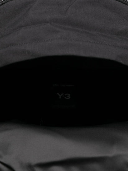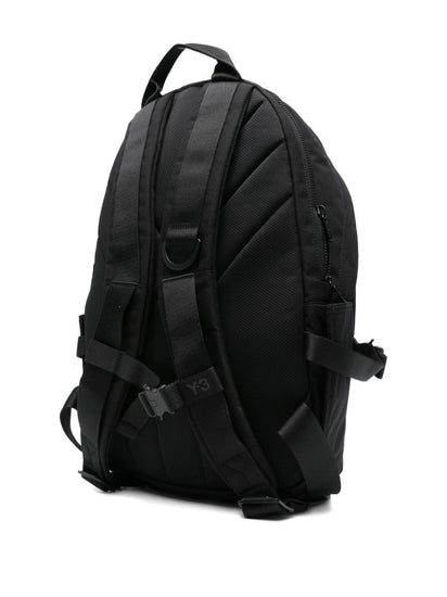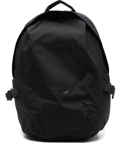 black two way zip fastening adjustable shoulder straps side buckle fastening straps logo detail curved silhouette Nylon backpack Size and Fit - DEPTH: 18.0 Centimetres. HEIGHT: 45.0 Centimetres. WIDTH: 33.0 Centimetres.